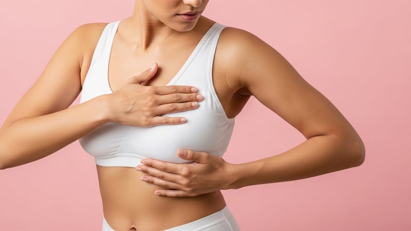 A soft, supportive, front-closing surgical or athletic-style bra is commonly used early. Underwire returns only after clearance and comfort.